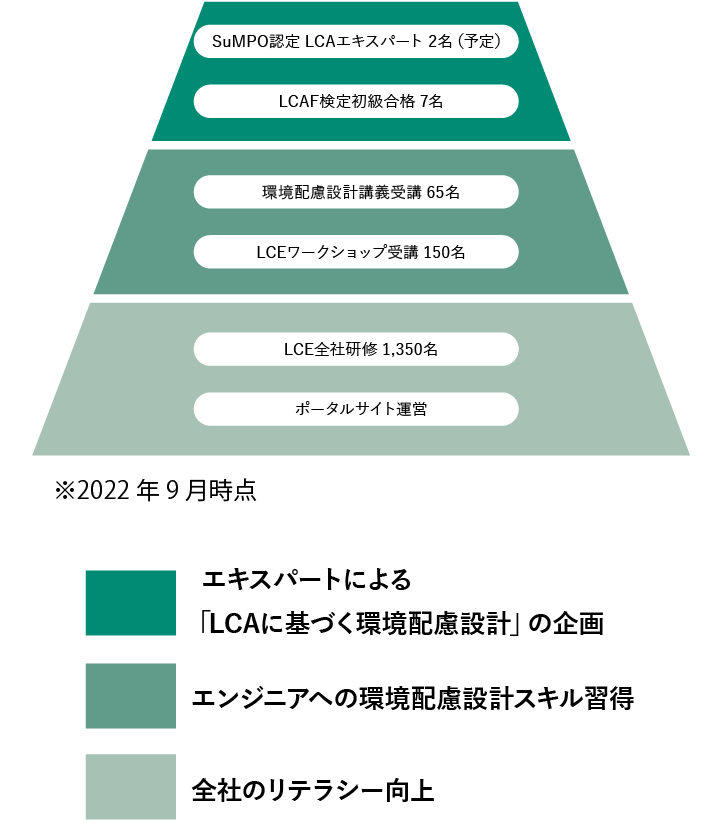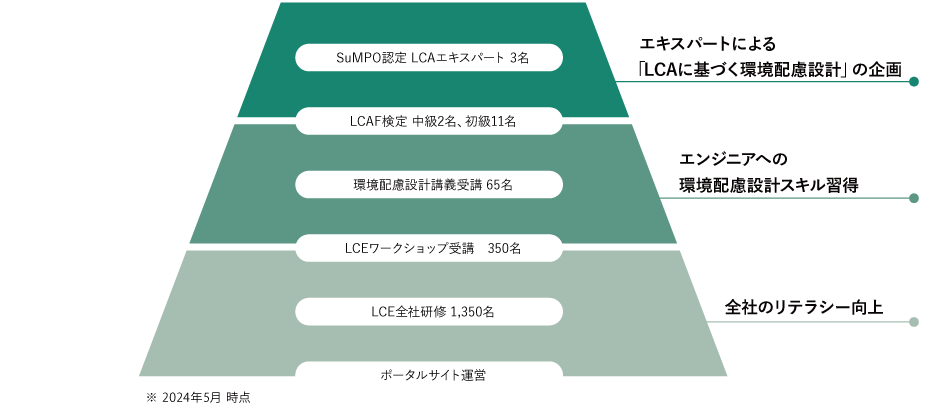 当社は、知恵や創造力を用いて環境配慮設計の在り方を進化させることを目指し、エンジニアに必要なスキル獲得を積極的に推進しています。社内では、早稲田大学 創造理工学部 福重 真一教授に講義いただき、 LCE(Life Cycle Engineering)や DfE(Design for Environment) の教育を実施しています。また、「LCEプロジェクト」を立ち上げ、エンジニアがLCEを知る、理解する、発信するという仕組み作りを行っています。